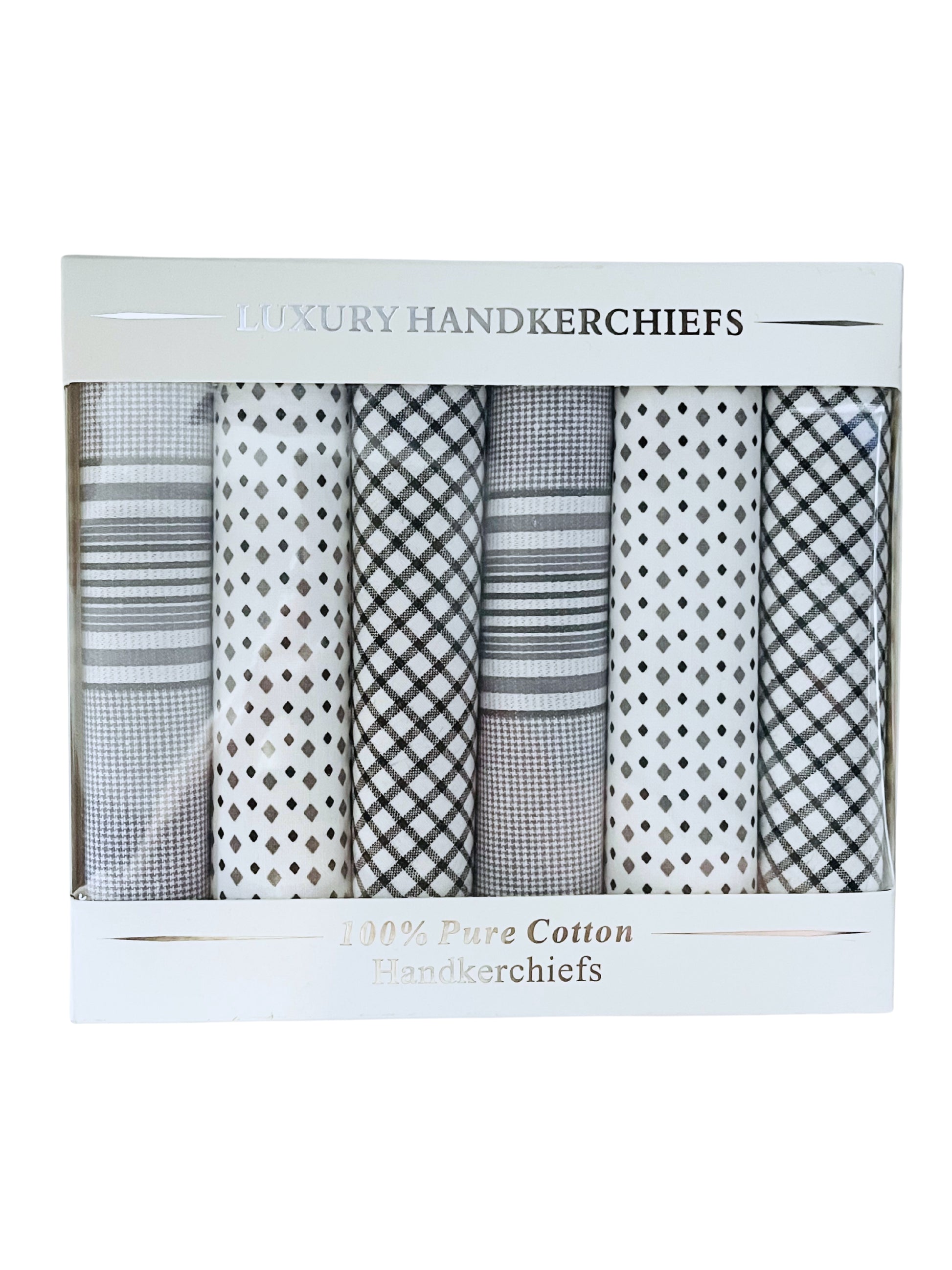 Elevate your everyday essentials with this refined collection of Le Château Men's Luxury Handkerchiefs. Thoughtfully crafted from 100% pure cotton, each handkerchief offers exceptional softness, durability, and absorbency. This classic set features six distinct yet harmoniously coordinated patterns—from subtle checks and stripes to timeless dots and plaids—designed in elegant shades of grey, black, and white.