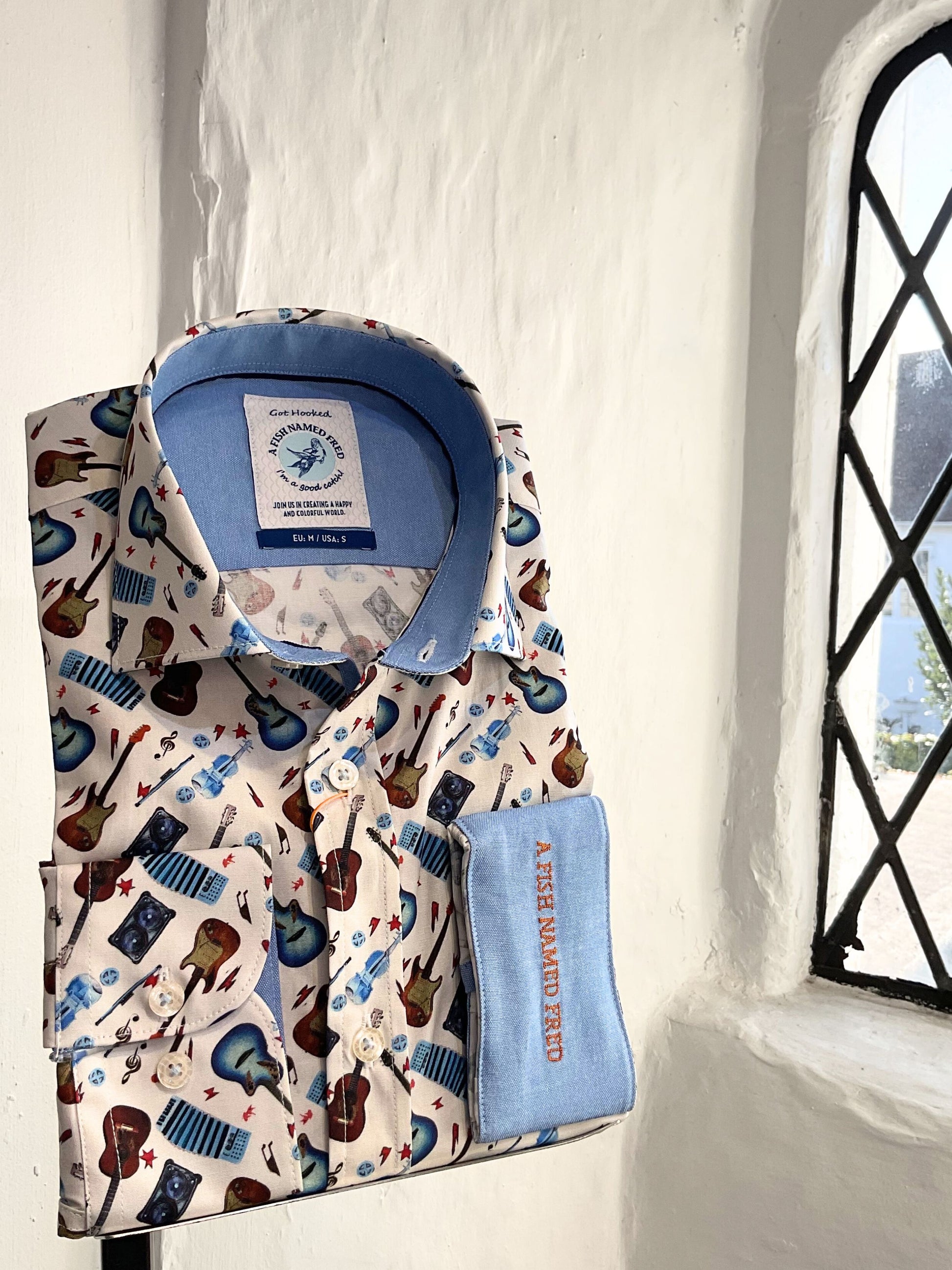 Turn up the volume on your wardrobe with the Guitars Shirt from A Fish Named Fred. This off-white shirt features a lively all-over guitar print, blending electric and acoustic motifs for a look that’s both musical and stylish. Whether you're heading to a gig, a casual Friday at work, or a night out, this shirt hits all the right notes.