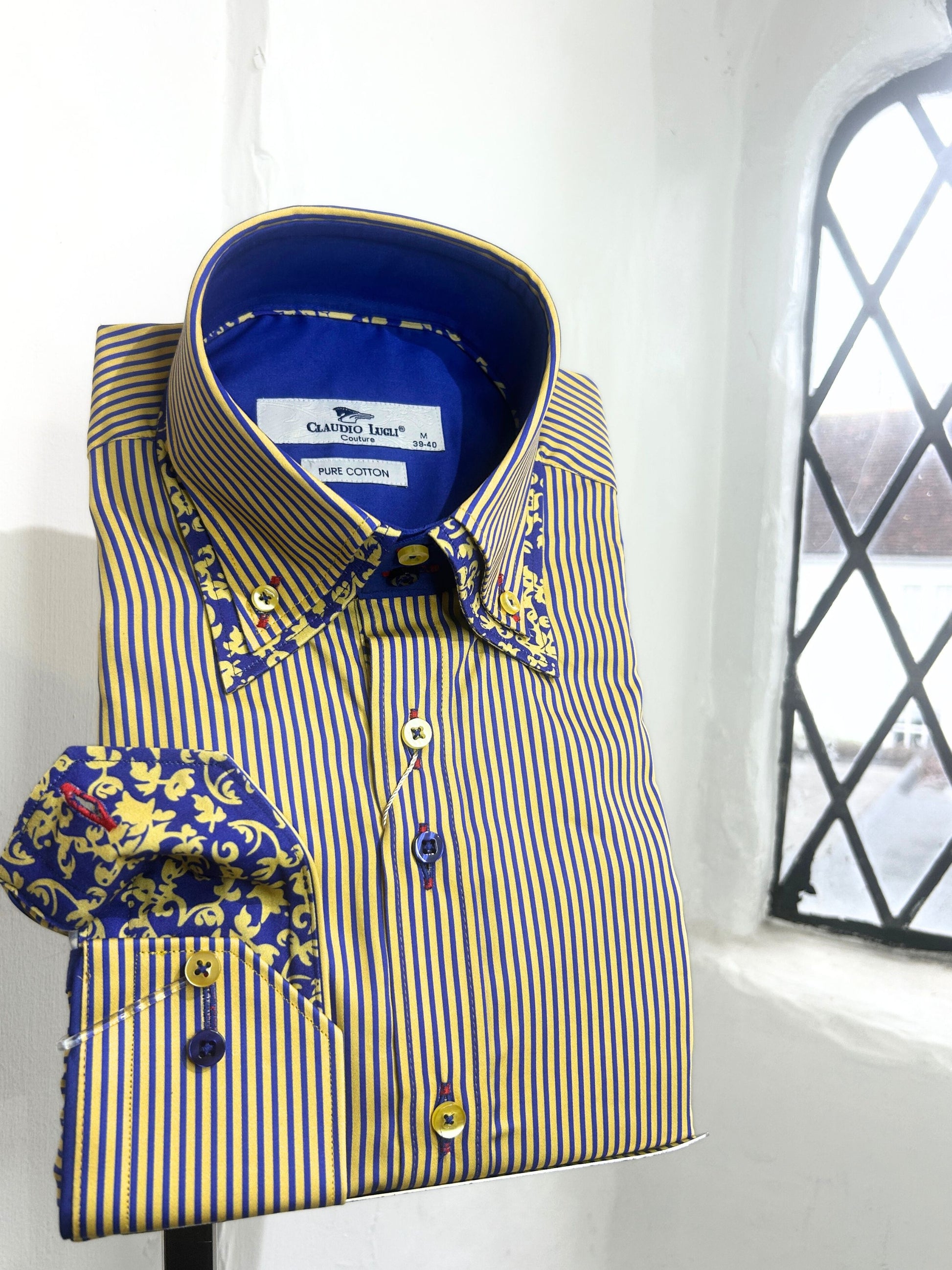 Elevate your wardrobe with the Claudio Lugli yellow and blue skinny stripe shirt - a shirt that embodies bold individuality and refined craftsmanship. Designed for those who dare to stand out, this piece combines luxury Italian tailoring with vibrant, high-definition prints that make a lasting impression.