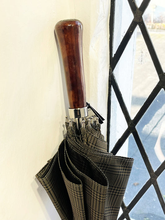 BROWN CHECK UMBRELLA WITH WOOD HANDLE