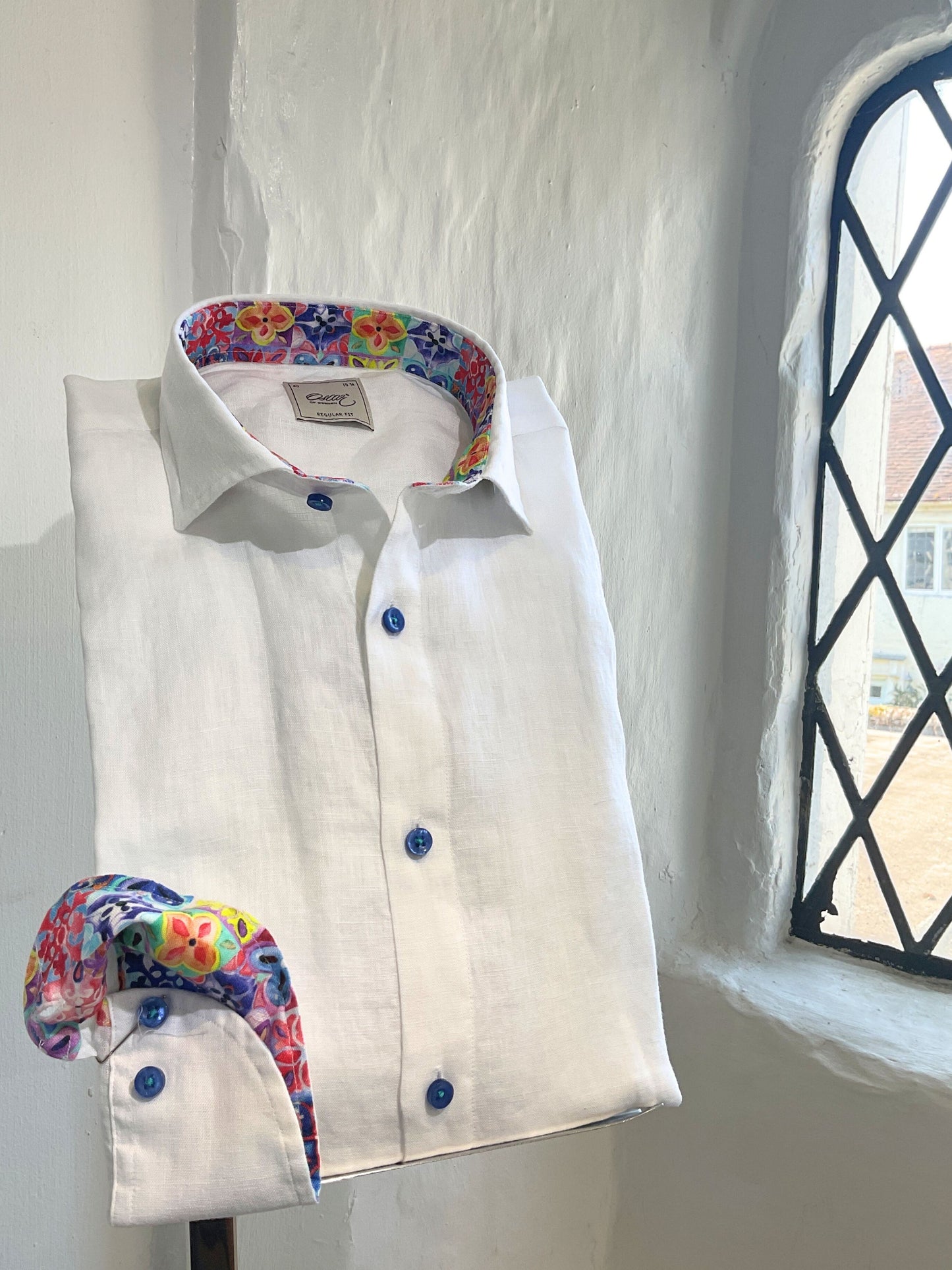 LONG SLEEVE WHITE LINEN SHIRT WITH MOSAIC TRIM